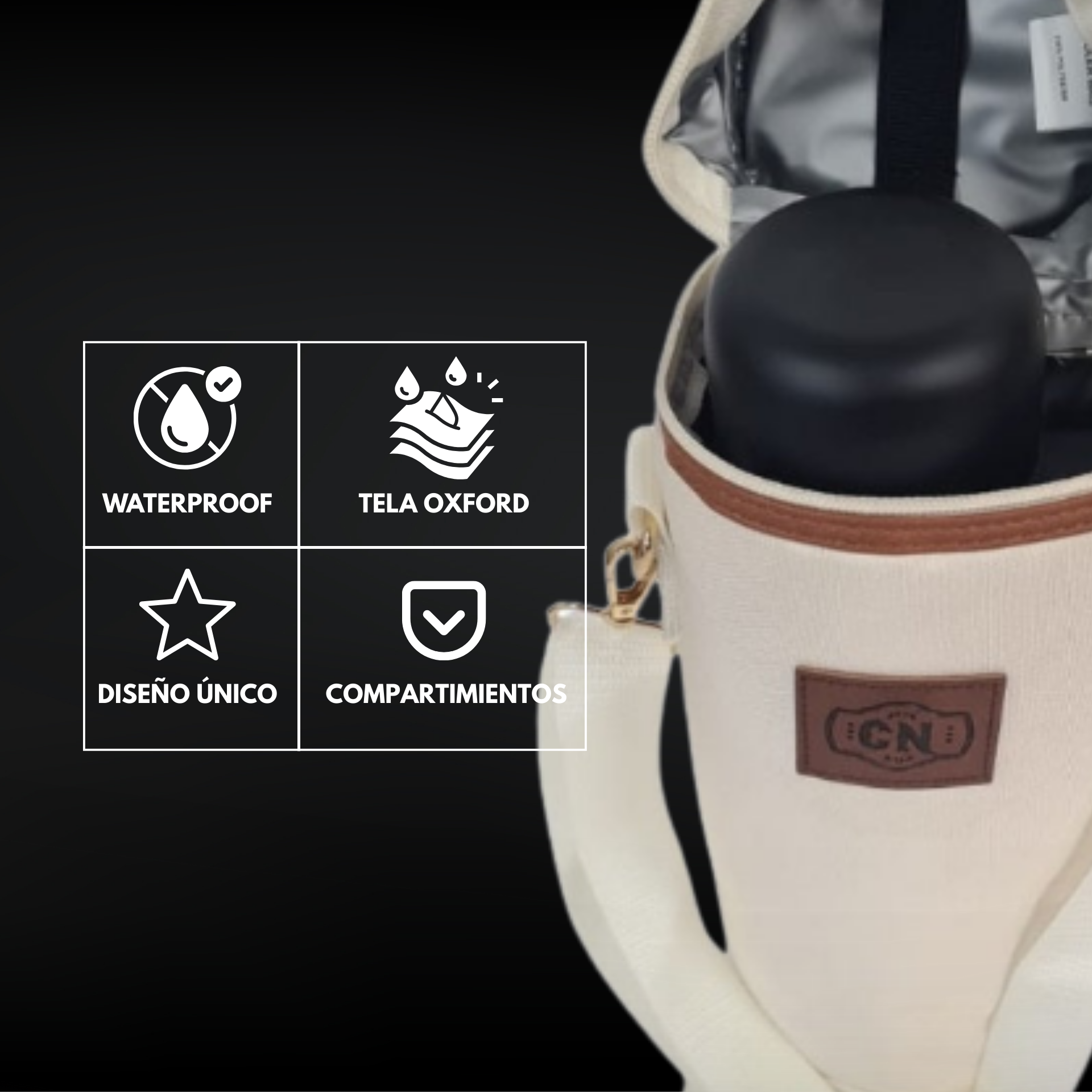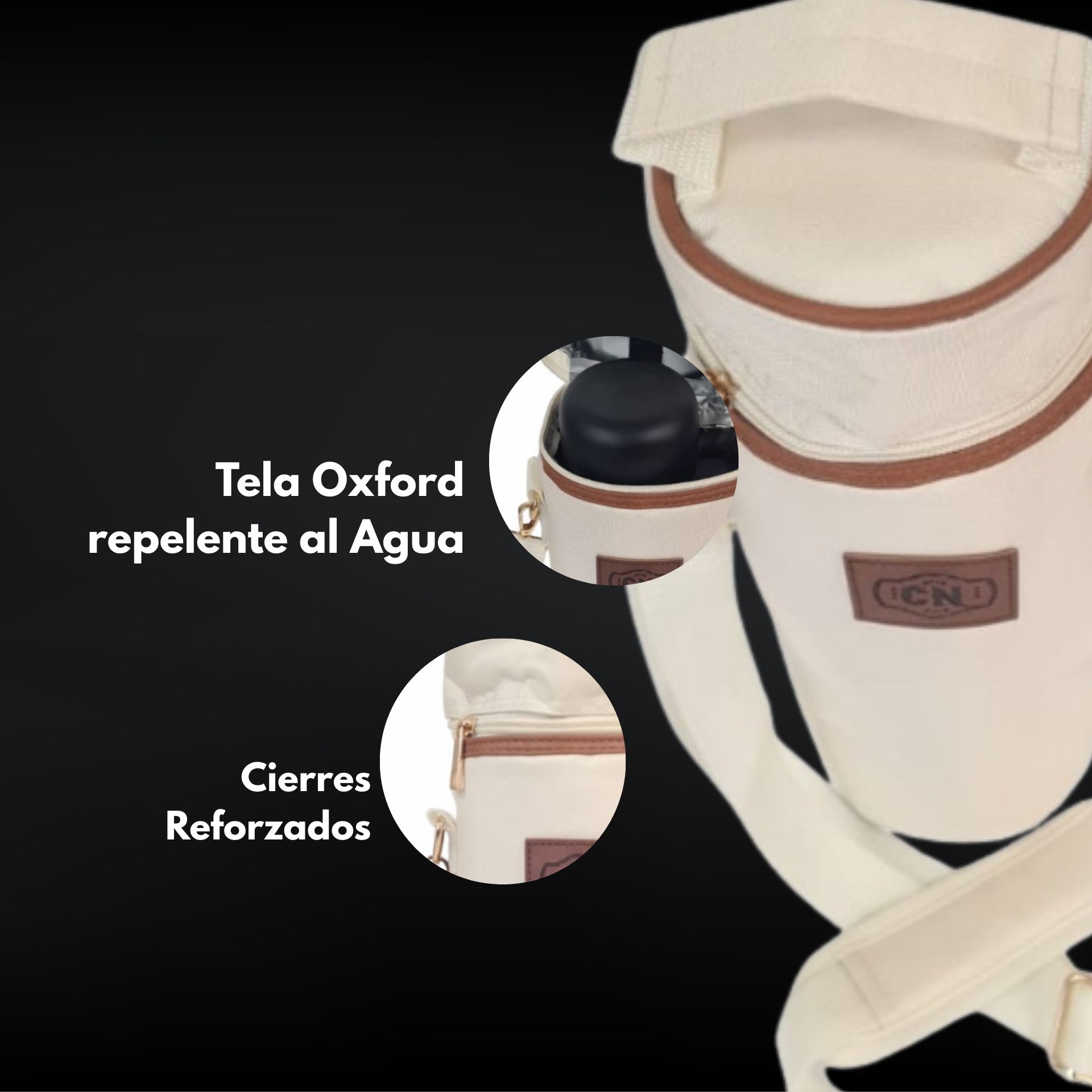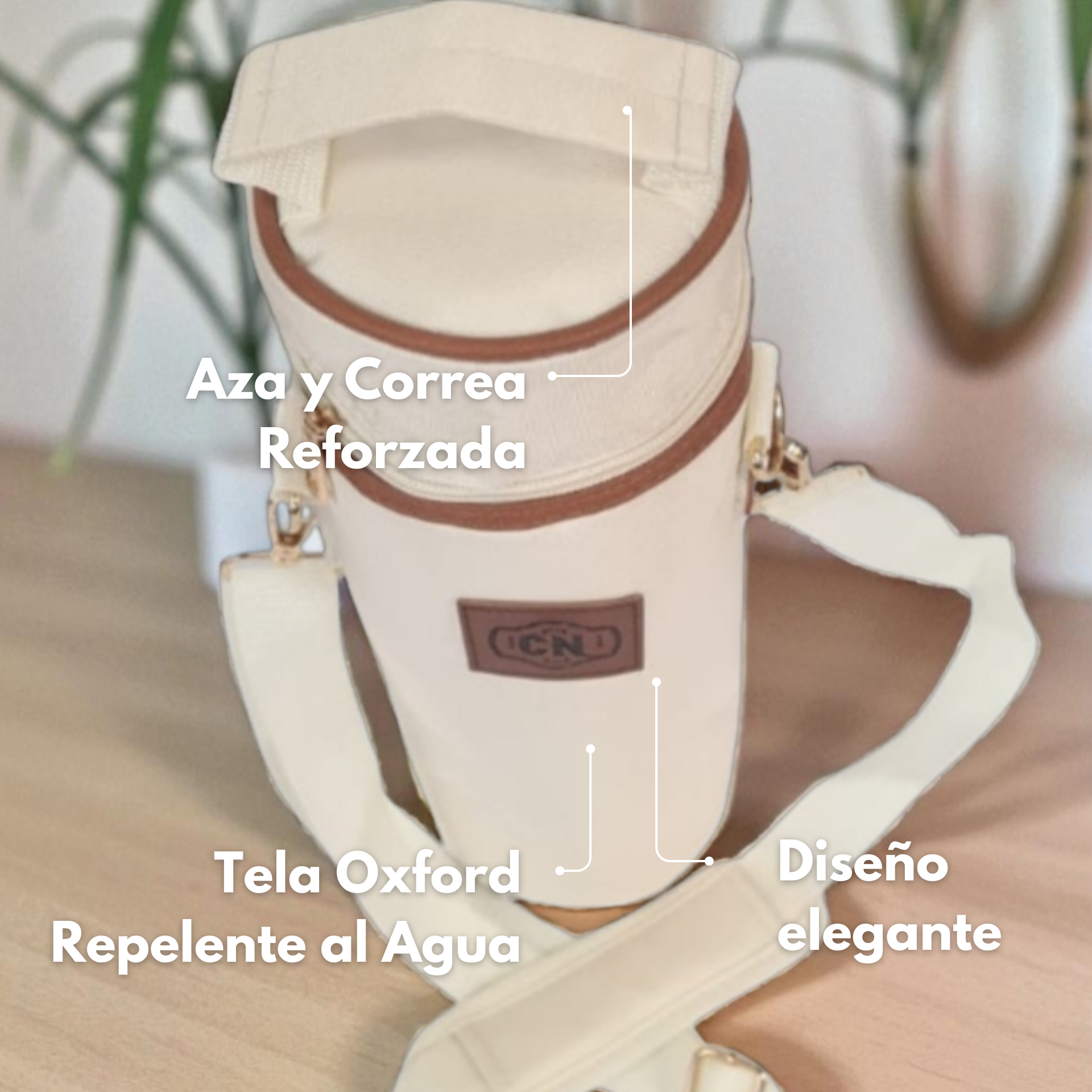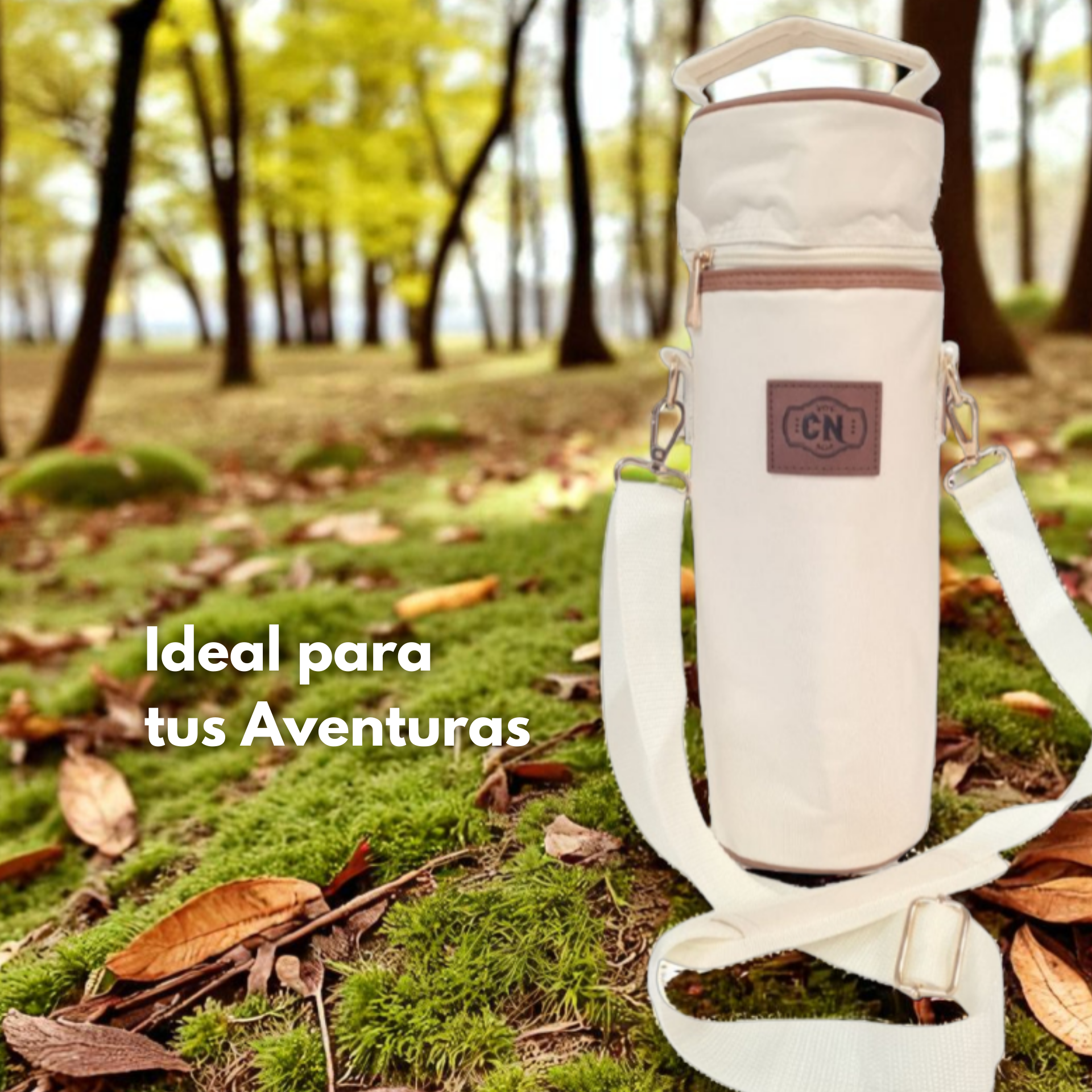 Su interior forrado protege tu termo y mantiene la temperatura, mientras que la correa ajustable de hasta 140 cm y la manija superior permiten llevarlo de la forma que más te acomode.