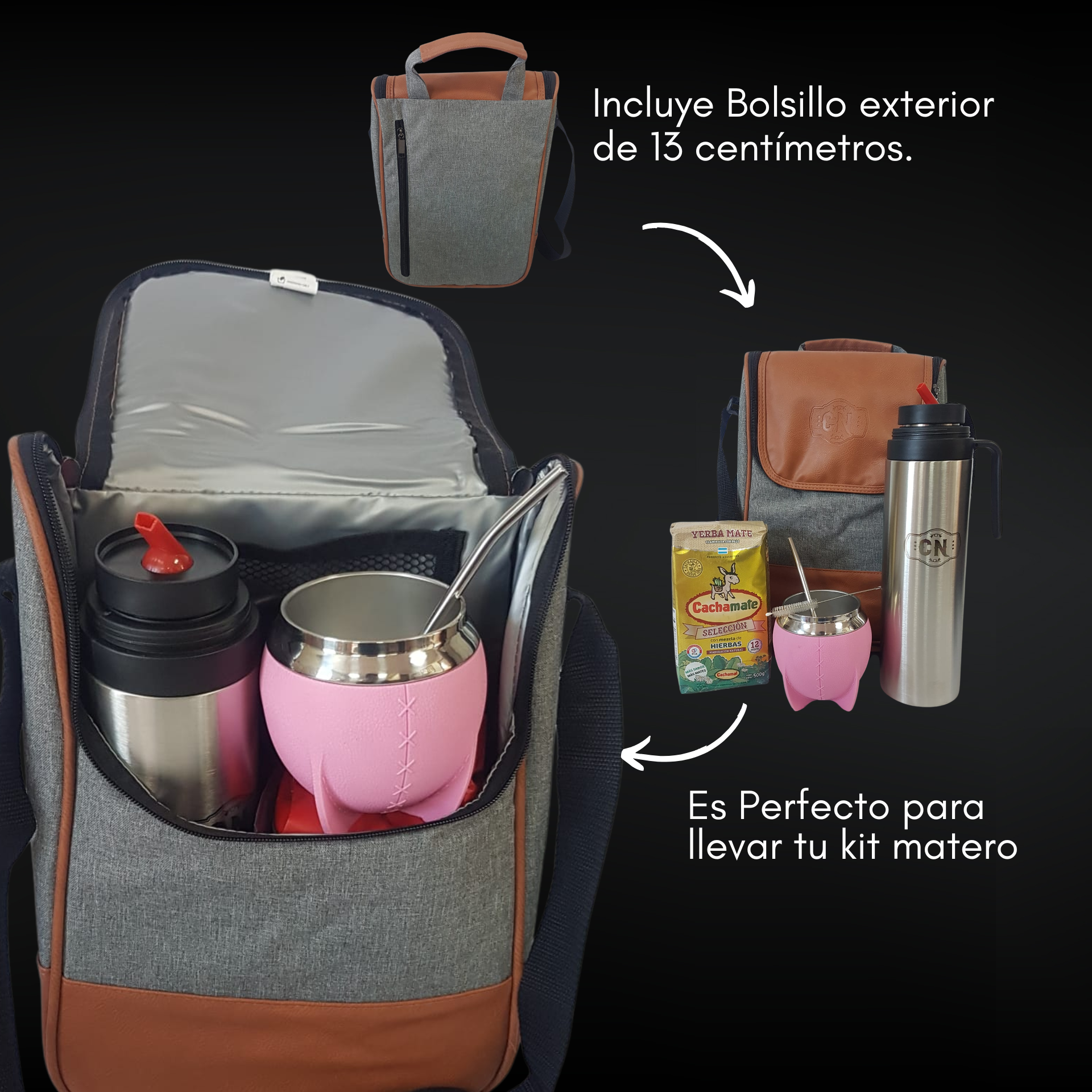 Lleva tu mate con estilo y funcionalidad con el Bolso Matero Gris Premium, fabricado en eco cuero resistente.