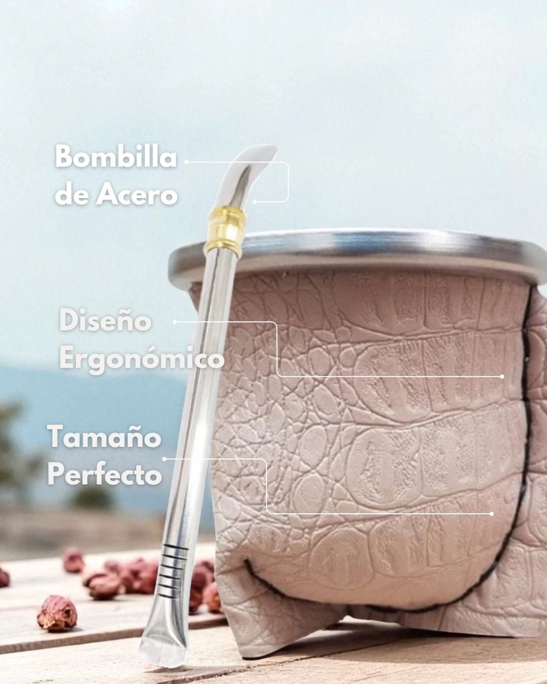 Kit Mate Crema con Bombilla | Vidrio Templado con Protección Térmica Goma Eva + Bombilla de Acero Inoxidable