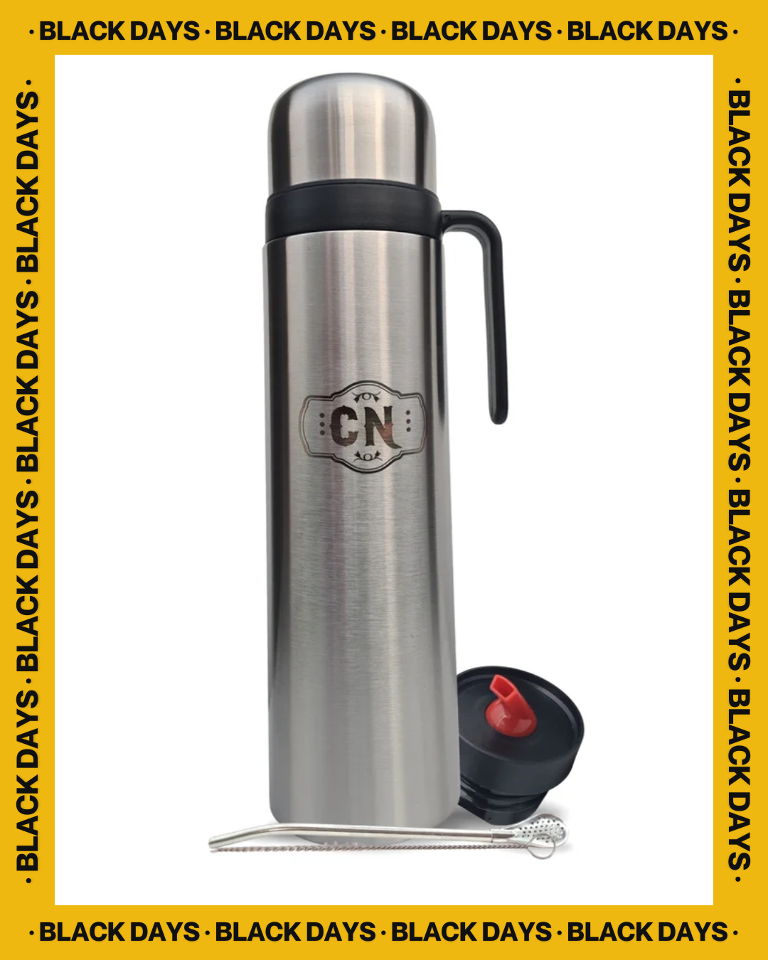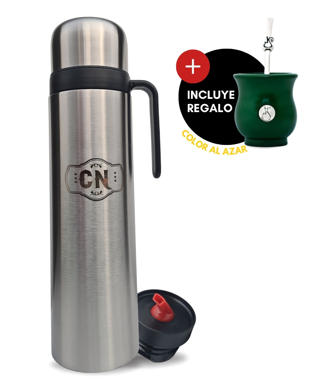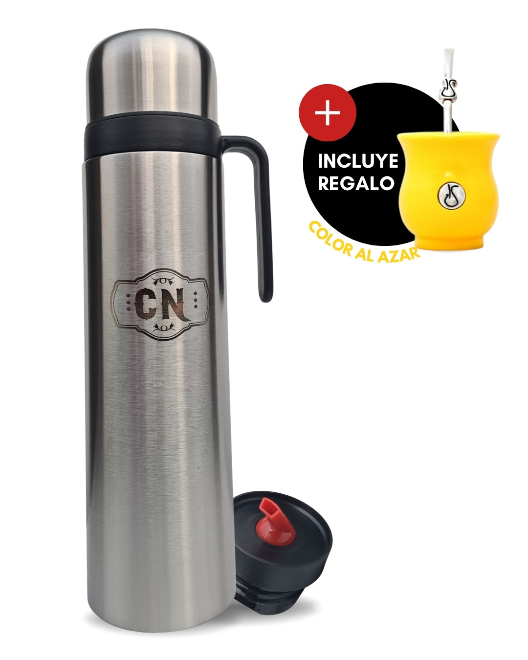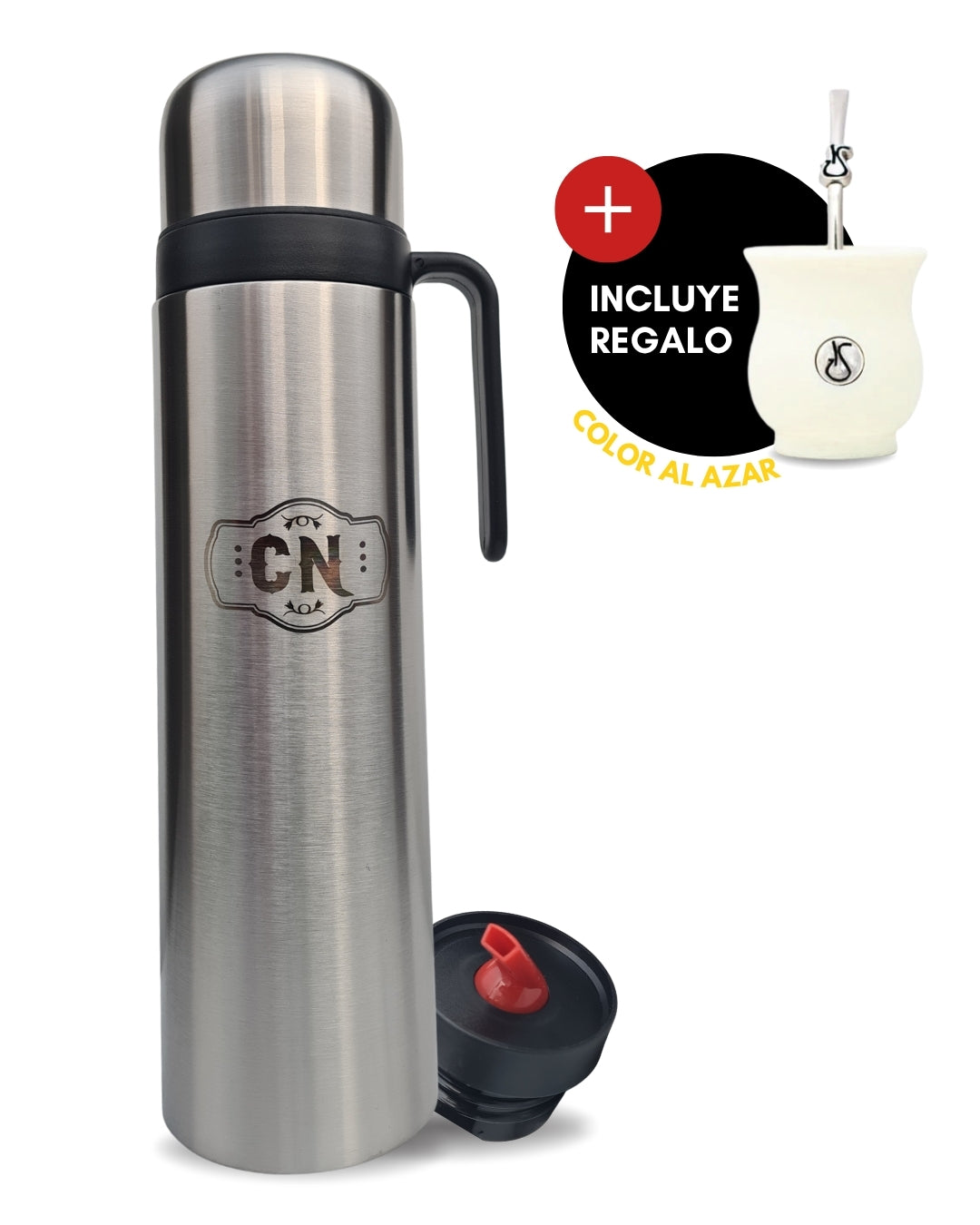 El termo de acero inoxidable plateado (1 litro) mantiene el agua caliente por horas, ideal para varias rondas de mate sin preocuparte por la temperatura.